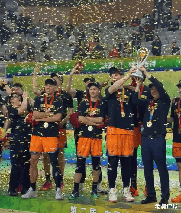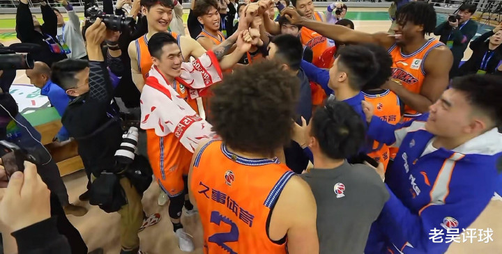 上海男篮夺冠后跋扈庆祝,球员齐围在系数,把卢伟指引站在最中间,系数庆祝。