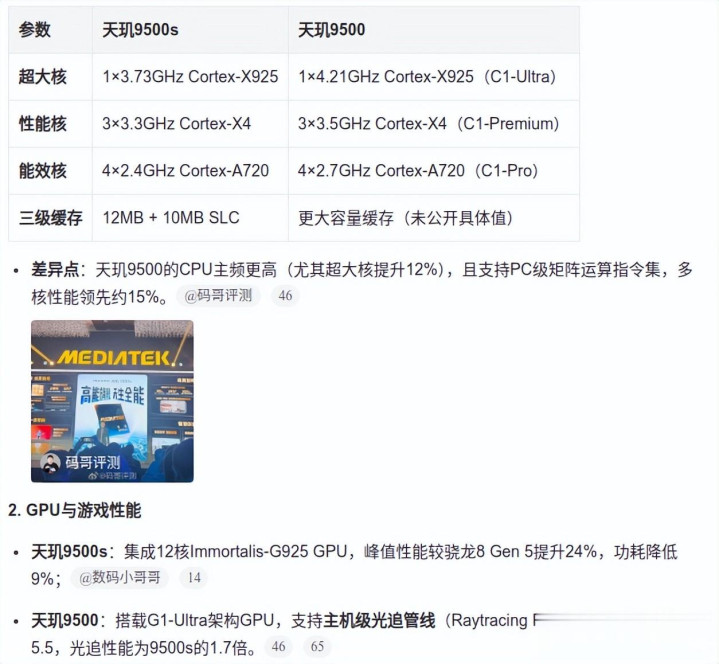天玑9500S它并不是天玑9500的加强版,它是天玑9500的简配版,红米Tubo5 Max首发,这颗芯片在CPU主频、GPU架构等进行了简配。红米公布的安兔兔跑分361万分(实验室跑分),天玑9500S优点是它的GPU三级缓存有12MB+10MBSLC,这点比骁龙8Gen5强,GPU拥有12核心,就看红米搭配天玑是不是表现的更好了。