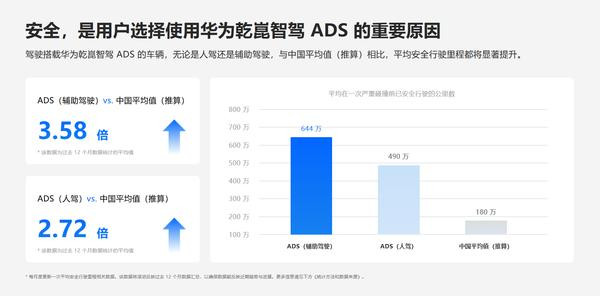 同时,根据官方披露的数据,在过去12个月的统计周期内,搭载华为乾崑ADS的车辆在辅助驾驶模式下,平均每发生一次严重碰撞事故前的安全行驶里程为644万公里;而在人驾模式下,该数值为490万公里。相比之下,中国平均水平(推算值)则为180万公里。这意味着,开云ADS辅助驾驶模式下的安全表现是中国人类司机平均值的3.58倍。