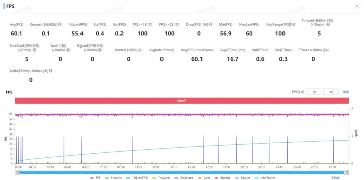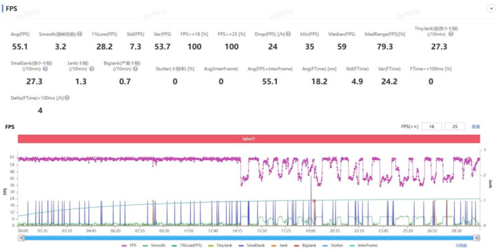 不过嘛,到了 “崩铁” 环节确实就有点绷不住了,30 分钟全高画质 “黄金的时刻” 跑图下来,平均帧率 55.1 帧,基本上到了后半程就会有掉帧现象。