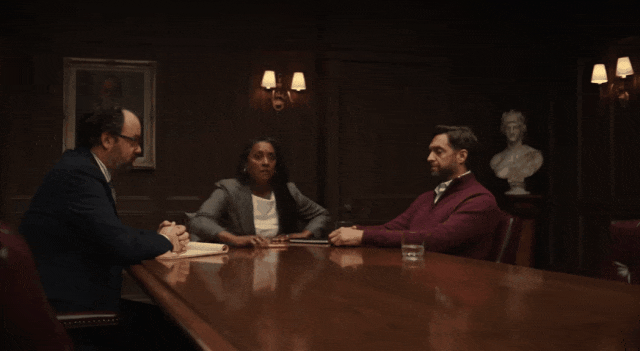 在这则广告中,两名律师在谈判桌上对峙。为了展示和解协议,一方律师将 iPhone 17 Pro Max 屏幕朝下,在布满微尘的硬木桌面上用力推向对面;而对方因不满报价,又将手机重重拍在桌上,又滑了回去。