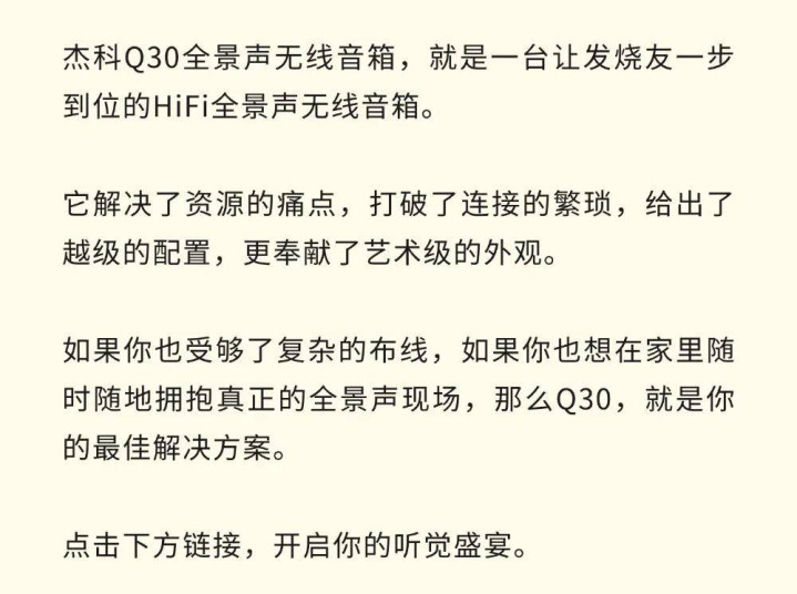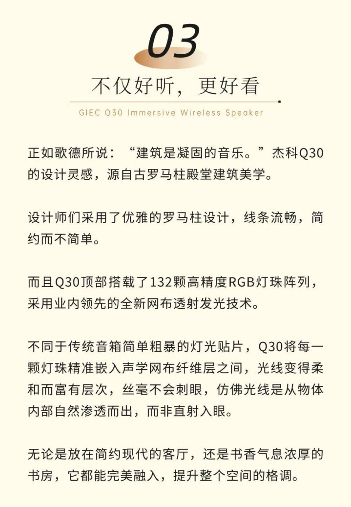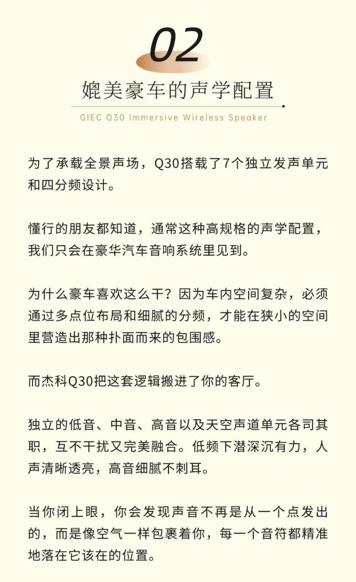 杰科Q30全景声无线音箱,就是一台让发烧友一步到位的HiFi全景声无线音箱。它解决了资源的痛点,打破了连接的繁琐,开云官方体育app给出了越级的配置,更奉献了艺术级的外观。如果你也受够了复杂的布线,如果你也想在家里随时随地拥抱真正的全景声现场,那么Q30,就是你的最佳解决方案。