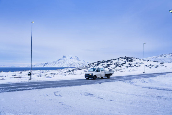 1月16日,一辆汽车行驶在丹麦自治领地格陵兰岛首府努克市郊。新华社发