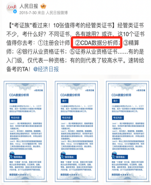 想要在这条路上走得更远,我有一个提议:探讨登第CDA数据分析师证书。这是数据限制公认的泰斗证书,与CPA、CFA皆名,受到东谈主民日报、经济日报等泰斗媒体的保举。