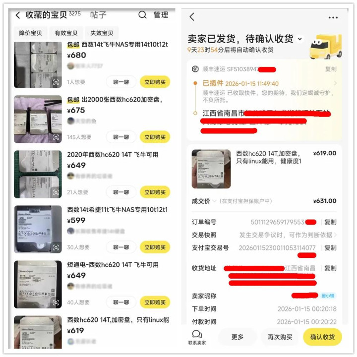 于是我去闲鱼搜了一下“西数HC620”,密密麻麻一堆商家在卖,属于14TB加密硬盘,价格比常规14T硬盘便宜很多,但又不是SAS接口,而是SATA接口。