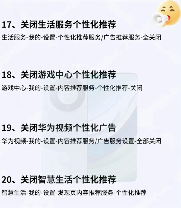 华为视频/音乐/阅读: 这三个影音软件,进设置里把“广告推荐服务”和“内容推荐”全部关掉。