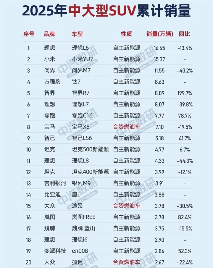 根据中汽数研的年度销量榜,在“中大型SUV”这个热门赛道上,上市半年的小米YU7已经排到了总榜第二,仅次于卖了整整一年的理想L6。