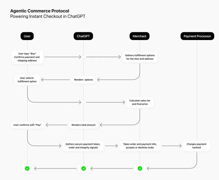 OpenAI的支付能力,主要靠和Stripe深度绑定、协同。双方联合推出了ACP(Agentic Commerce Protocol)协议,作为协调AI、支付、商家的标准。