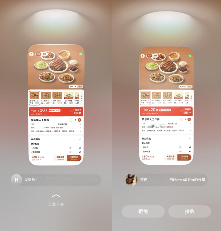 轻轻一碰,美食瞬间分享:找到了心仪美食的好价?两台鸿蒙手机“碰一碰”,就能快速分享给身边的朋友,不需要繁琐的转发步骤,就能同步浏览、一起挑选,让发现美食的过程变得更加好玩,也让每一次消费决策都更富乐趣!