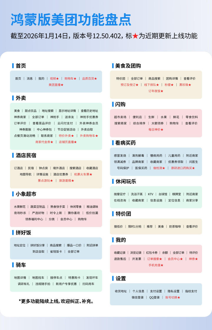鸿蒙版美团本次更新还包含一系列生活服务功能的优化与扩展,全面覆盖用户“吃喝玩乐行”的多元场景: