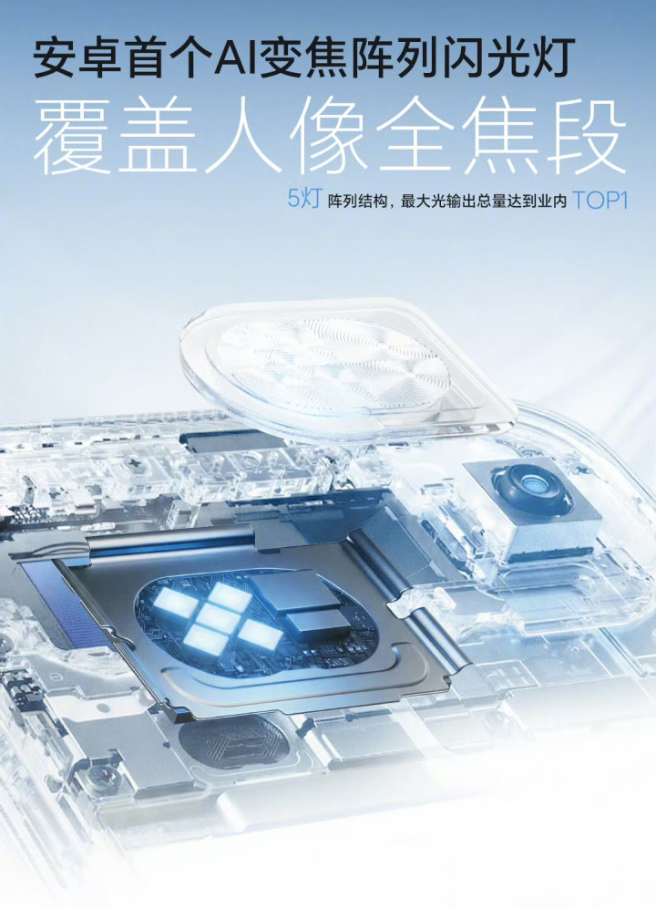5000万像素超广角镜头则能满足用户的大场景拍摄需求,比如风景、建筑等。值得一提的是,这款机型还搭载了安卓首个5灯结构的AI变焦闪光灯,能覆盖人像全焦段,解决了夜间人像拍摄的补光难题。