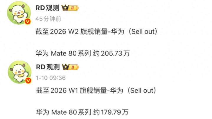 根据站哥的爆料,截止到W2(2026年1月11日),华为Mate80单品激活量为150万台,逆袭成为年底国产国产旗舰第一名。作为横向对比,华为Mate80系列销量为205.73万台,其中华为Mate80占比达到了72.9%,当然Pro系列机型各种断货也是导致该现象的主要原因。在电商自营平台,华为Mate80基本上已经实现了现货供应,下周的激活量数据依旧值得期待。