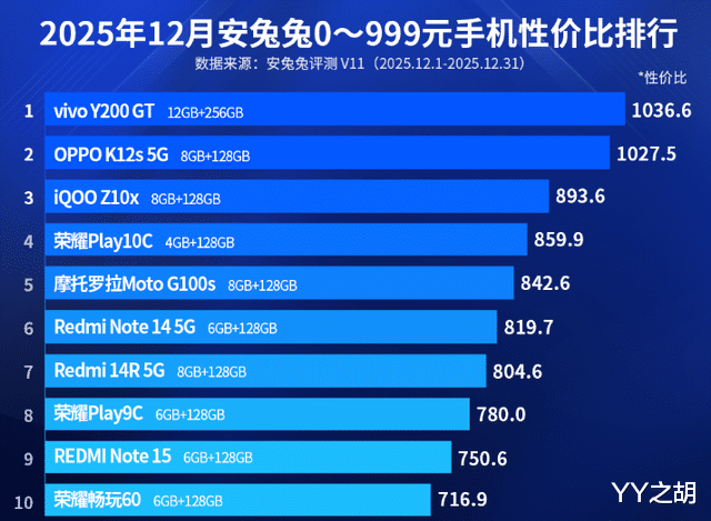 具体来说,在2025年12月安兔兔0—999元手机性价比排行榜中,vivo Y200 GT和OPPO K12s 5G分列第一名和第二名。在安兔兔平台上,这两款智能手机的性价比评分分别为1036.6分和1027.5分。其中,vivo Y200 GT这款手机采用了时尚简约的设计风格,机身线条流畅,手感舒适。无论是屏幕的边框处理,还是后盖的材质选择,都体现出了vivo对于细节的极致追求。同时,vivo Y200 GT这款智能手机还提供了多种配色方案,满足了不同用户的审美需求。