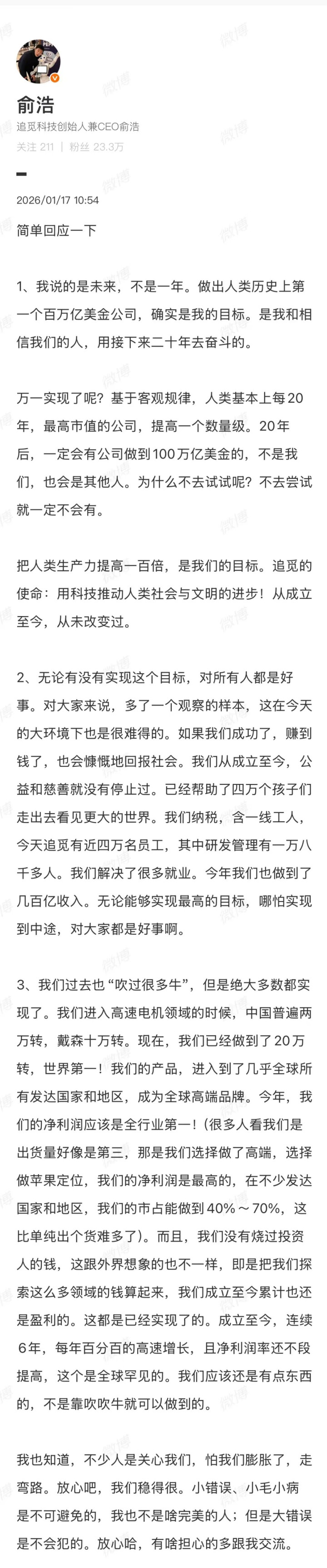 俞浩表示,把目标定在百万亿美元市值一事,时间是未来,不是一年。他和所有相信追觅的人一起干,按规律,人类最高市值公司每二十年抬一个量级,二十年后必有企业站到100万亿美元台阶,不是追觅也会是别人,他们为什么不去试,不试就永远没机会。