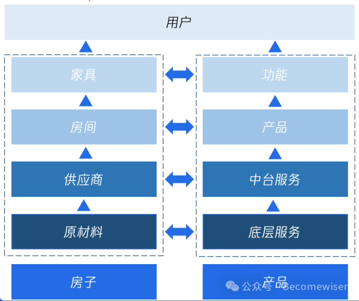假如把房子比作产品,居住者是我们的用户,产品架构描述的是房子的构成,产品是房间,功能是房间里的家具,中台服务是某类供应商例如家电、床品,而底层能力是最原始的石头、木头。