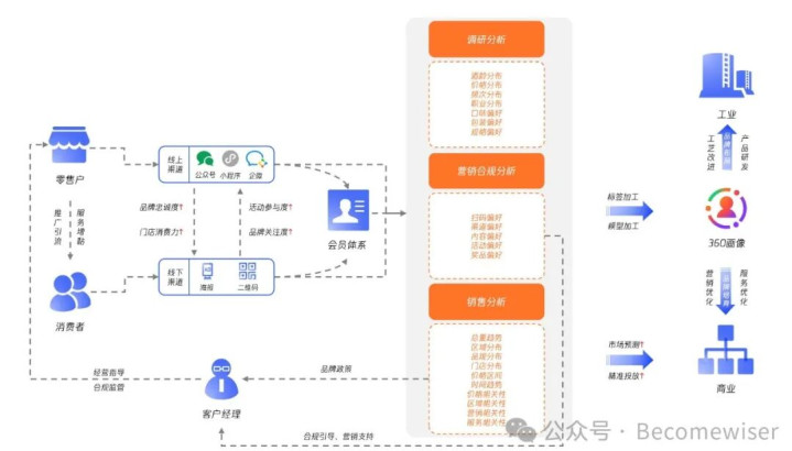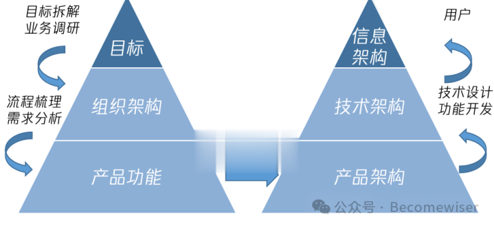 而业务流程的抽象又会变成产品架构,进而细化成B端的产品来支撑业务的运作,经由产品和技术设计呈现的信息架构,就是所谓的C端产品,直接面向客户。
